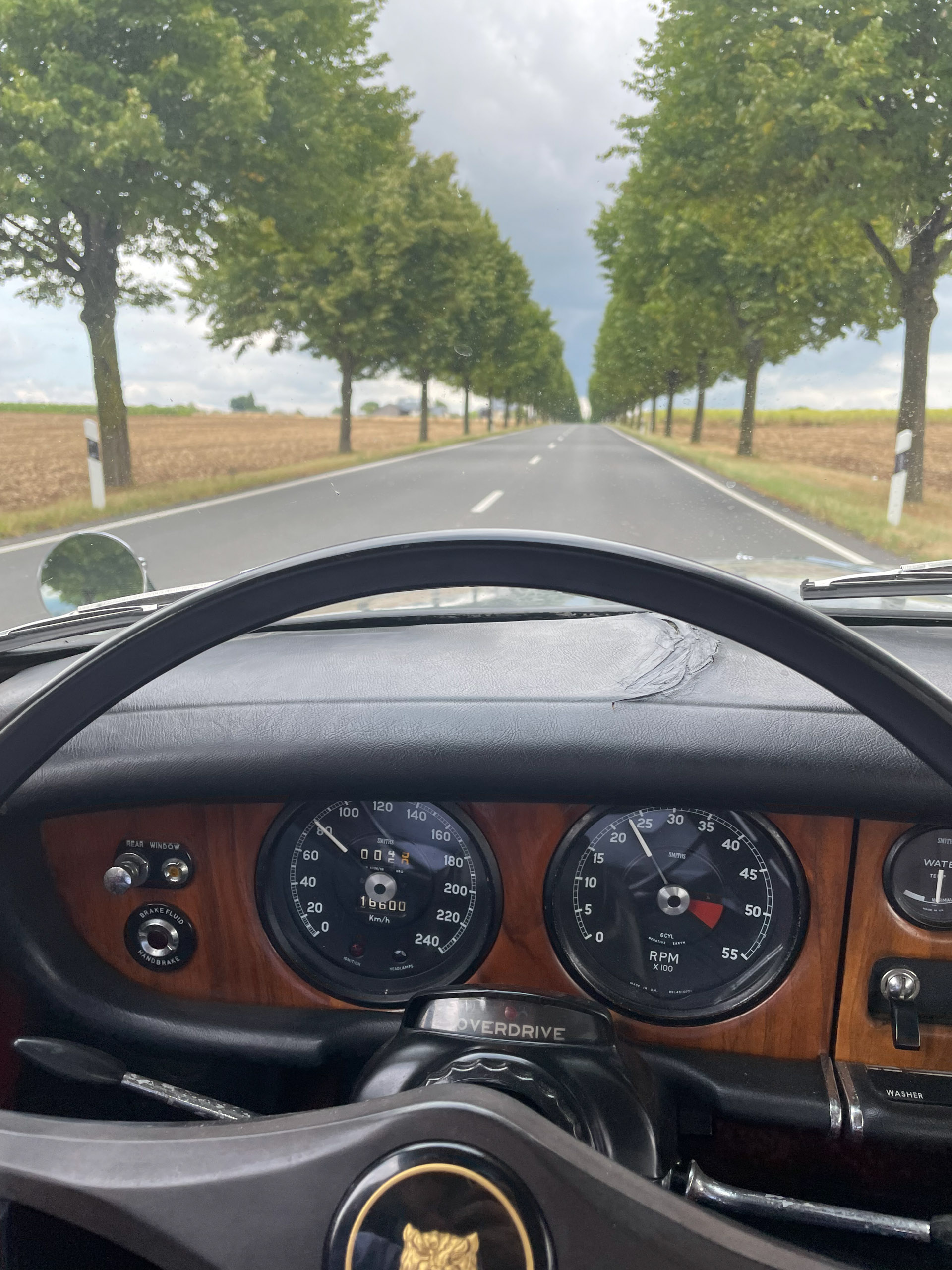 This specific example was originally sold to Switzerland, as per the Jaguar Heritage certificate. I bought it from a gentleman in the Netherlands who had a few repairs done, all of which are documented in a thick file. The car starts reliably and runs great, the overdrive making longer country road or highway trips very comfortable. The engine consumes some oil, filling up regularly with mineral Castrol keeps it happy.